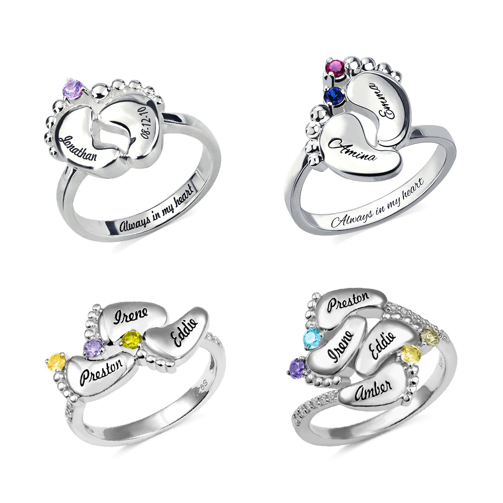 Show off your baby's name with this unique name ring. Personalized baby feet rings, the perfect silver rings to celebrate the family milestones in your lives. We carefully apply name and birthstone your choice to either side of the baby feet to create these beautiful, highly personal, celebration rings. Honor every new mom of your life with this meaningful ring!